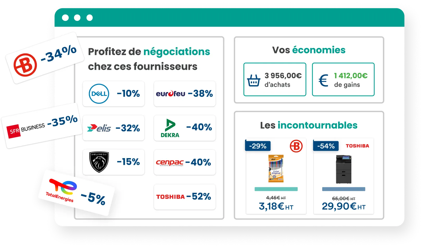NOVETUDE donne accès à des tarifs déjà négociés auprès de plus de 100 fournisseurs nationaux : photocopieurs, fournitures de bureau, téléphonie, informatique, extincteurs, contrôles réglementaires, véhicules, finance, RH...